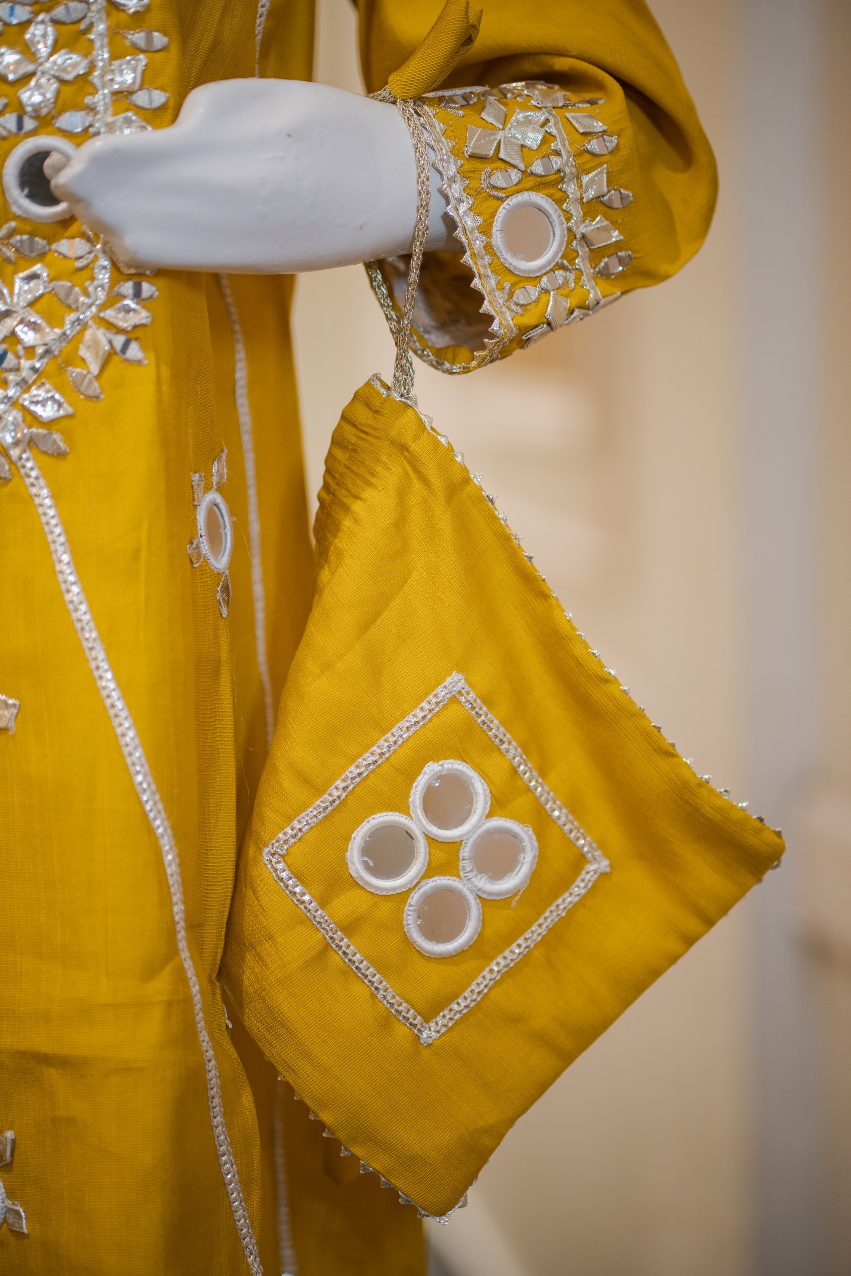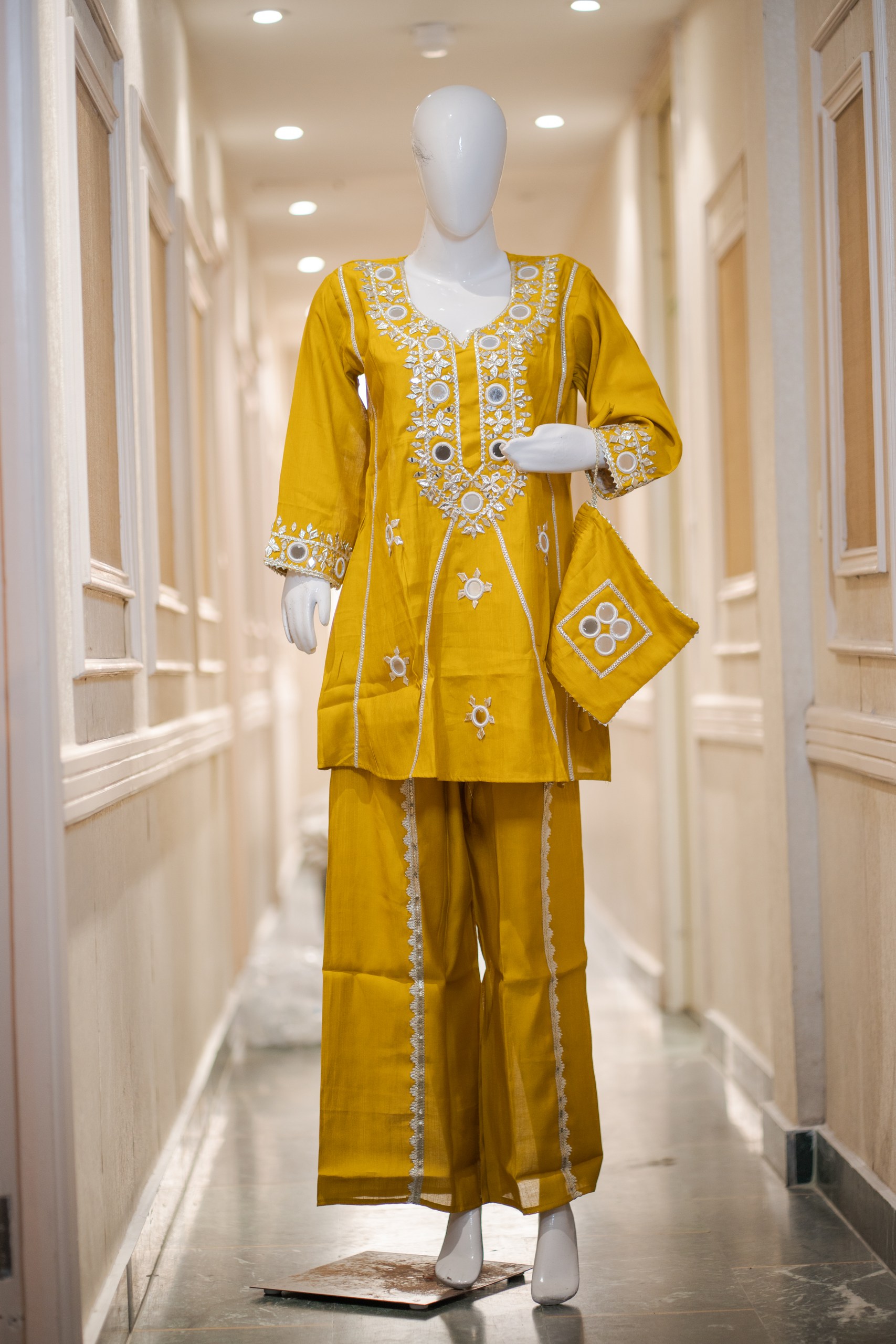 Step into festive elegance with this stunning Peplum Style Palazzo Co-ord Set with Mirror Work, designed to give you a trendy yet traditional look. Crafted in a vibrant mustard yellow shade, this outfit features a stylish peplum kurti paired with matching palazzo pants and a beautifully coordinated potli bag.