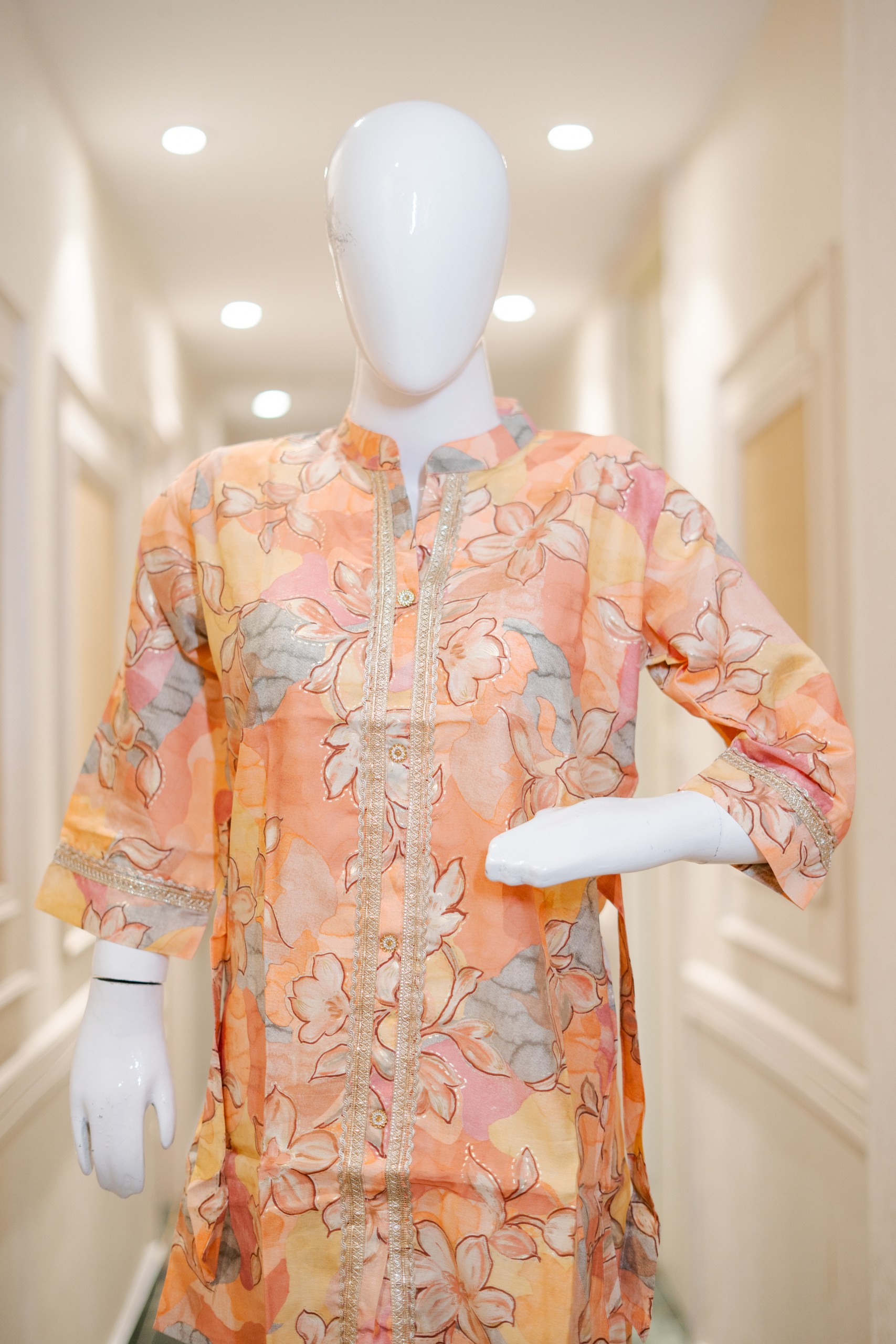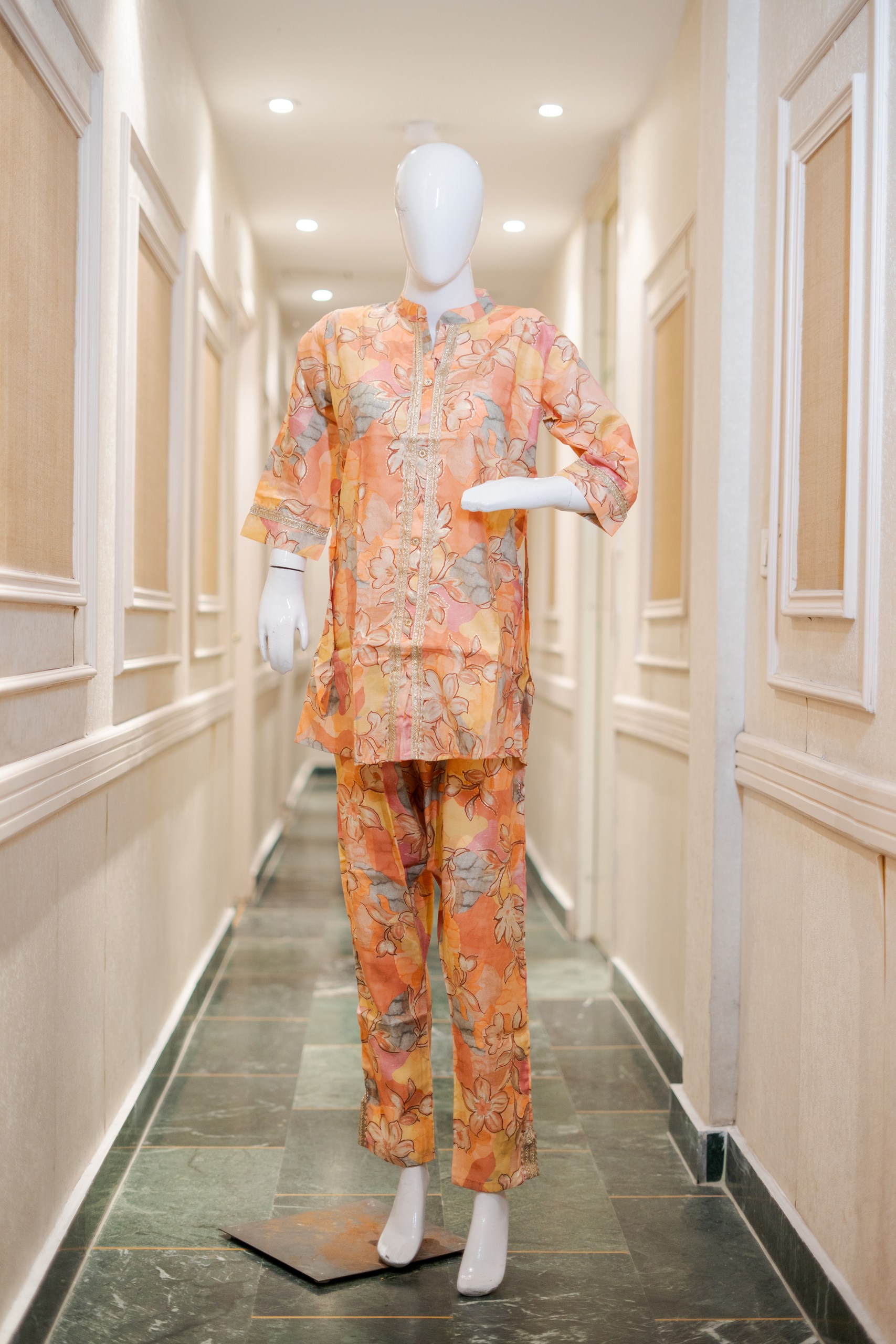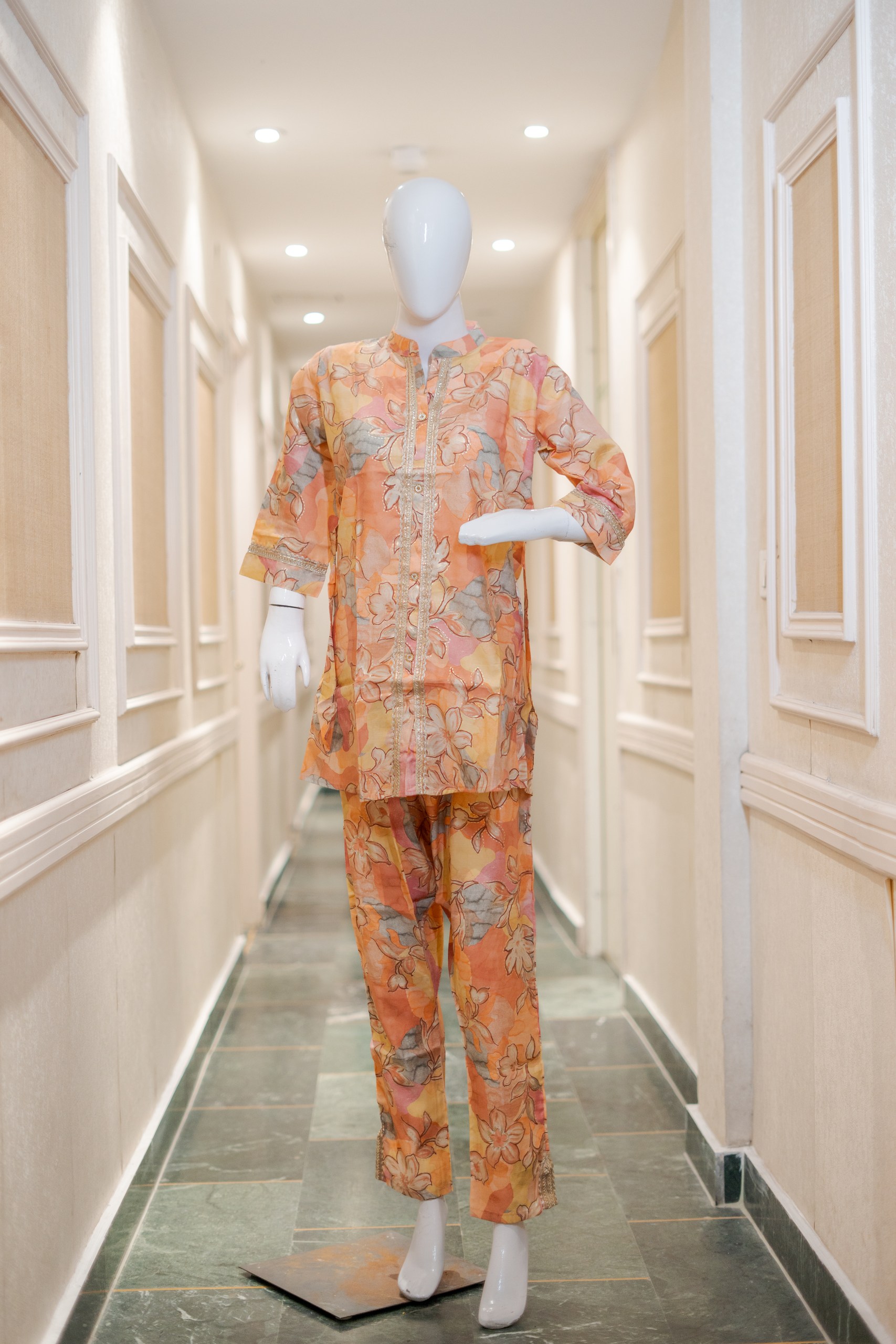 Be the first to review “Printed Chinese Collar Co-ord Set with Lace & Foil Work – Orange Floral Se”