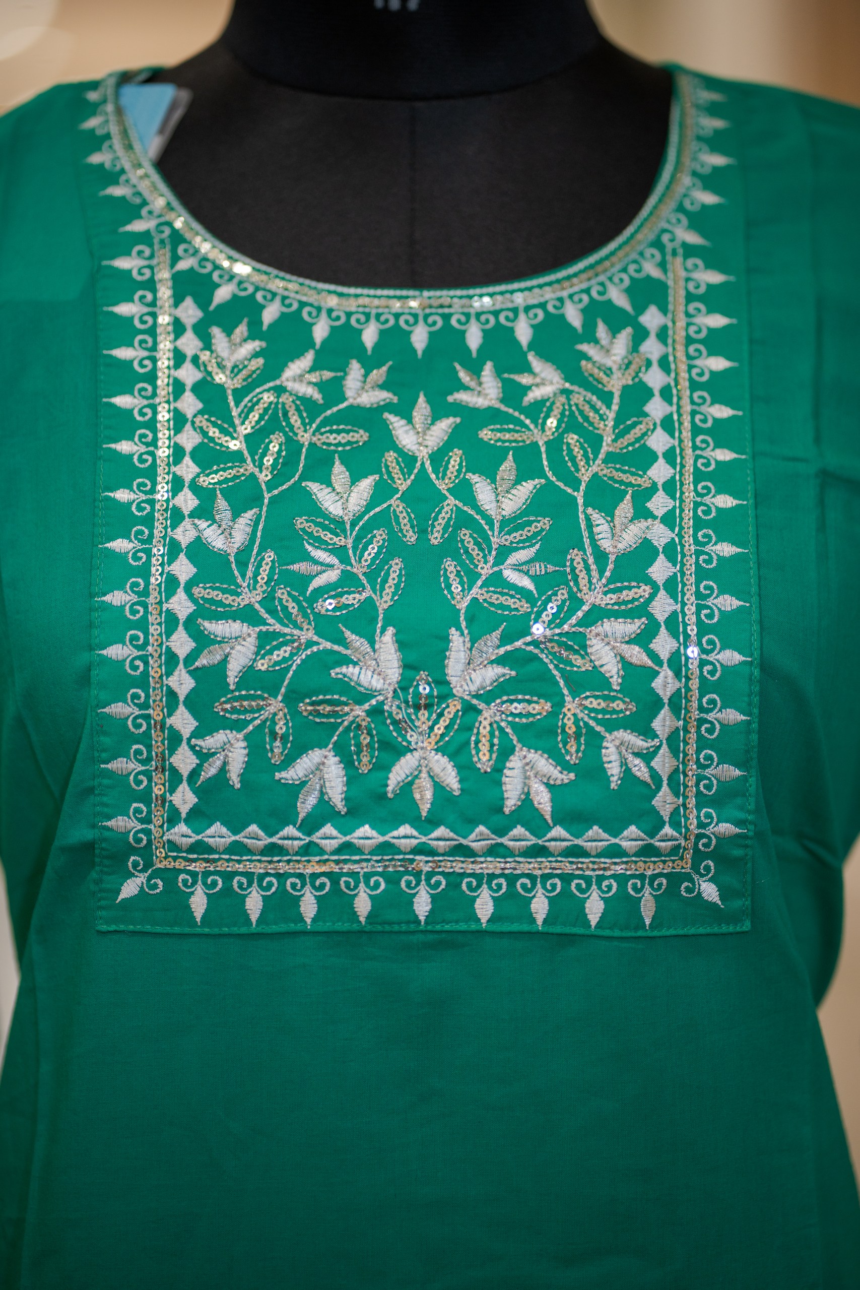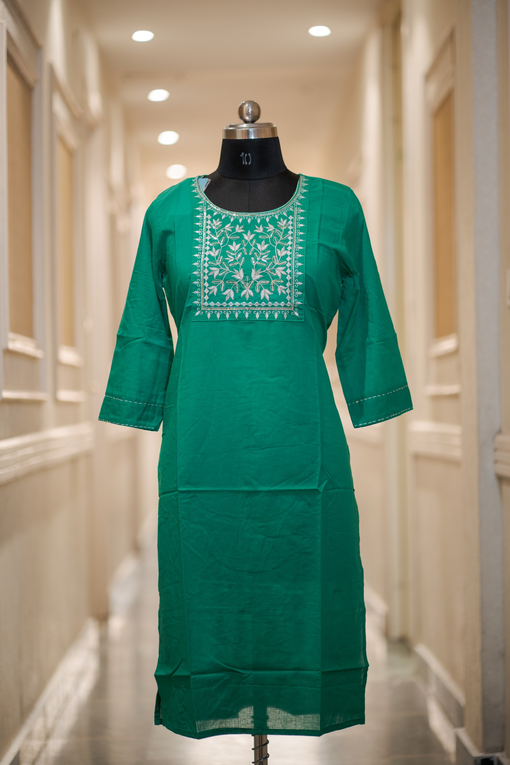 Stay comfortable and stylish with this elegant Pure Cotton Kurti with Zari Embroidery, perfect for everyday wear. Designed in a rich green shade, this kurti offers a fresh and classy look suitable for office, casual outings, and daily use.