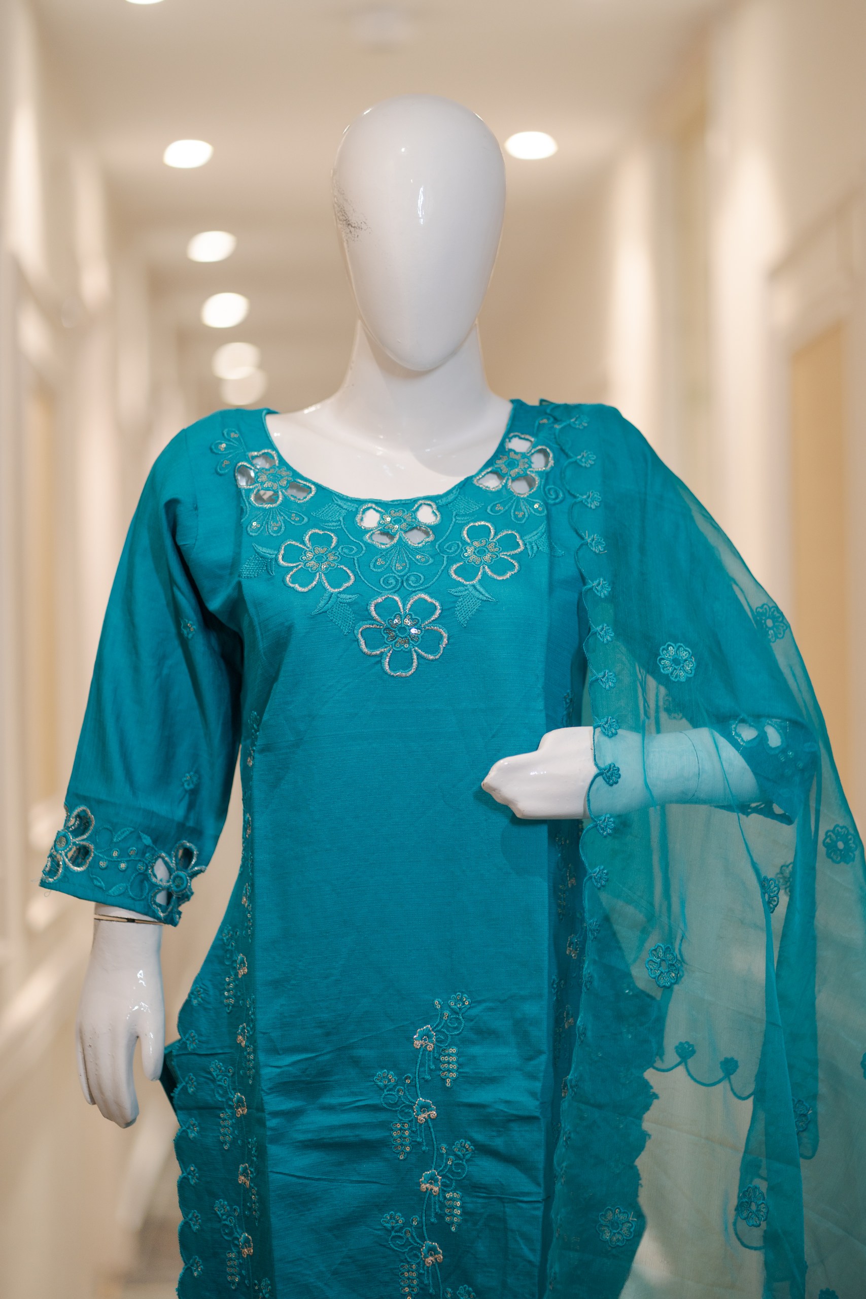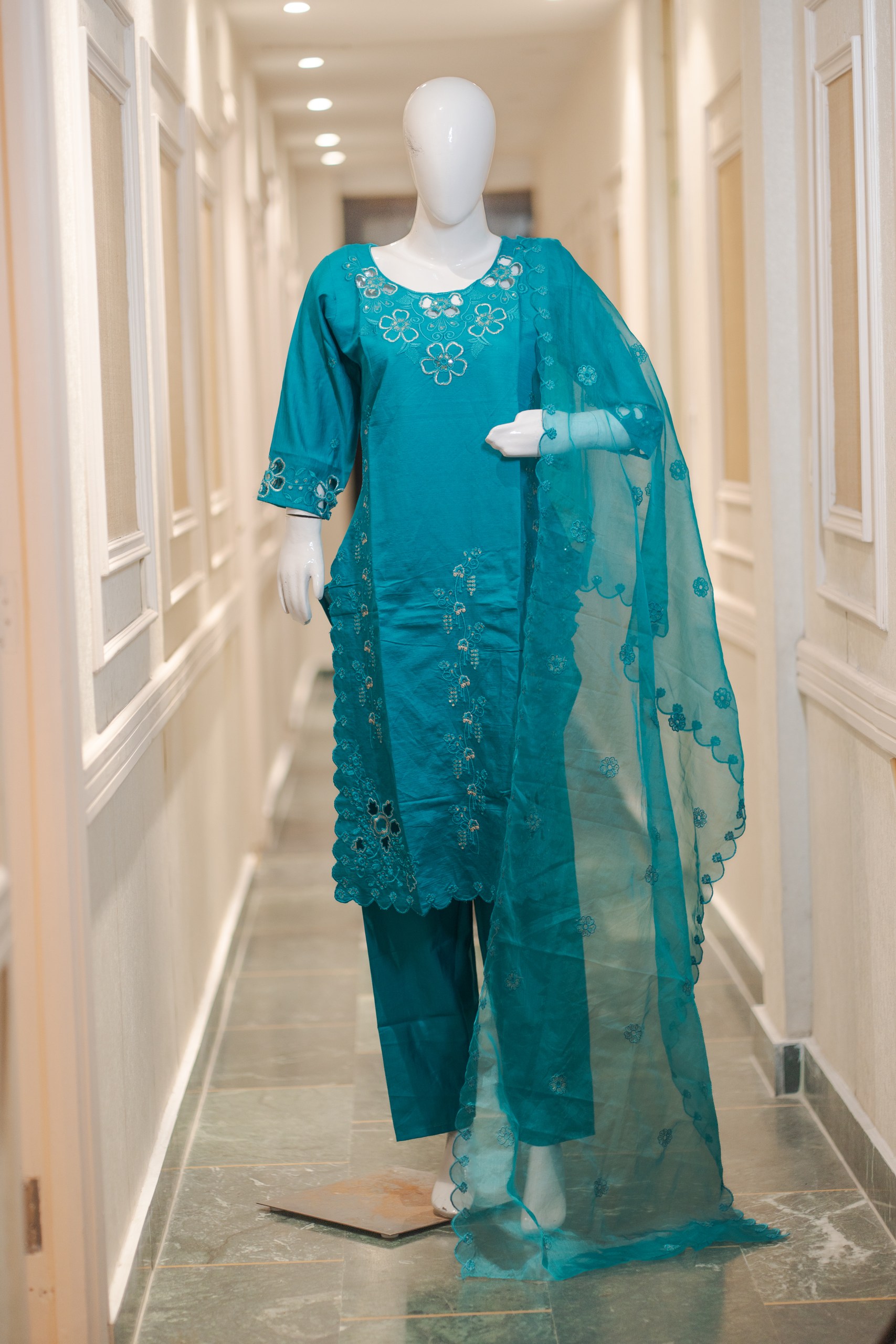 Step into elegance with this luxurious Silk 3 Piece Suit with Heavy Cutwork, designed to give you a rich and graceful ethnic look. Crafted in a stunning teal shade, this outfit features a beautifully tailored kurti, matching silk bottom, and a statement organza dupatta.