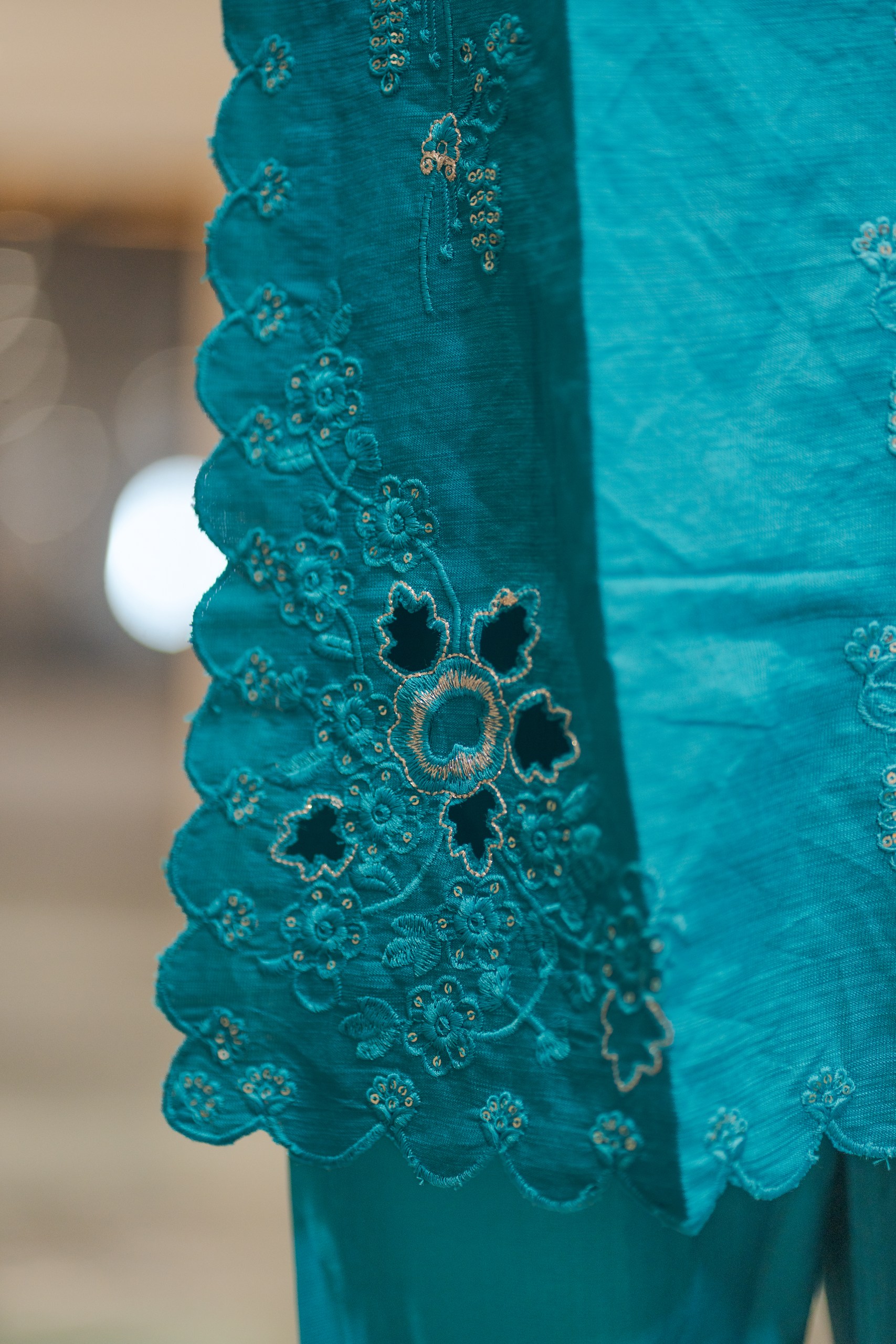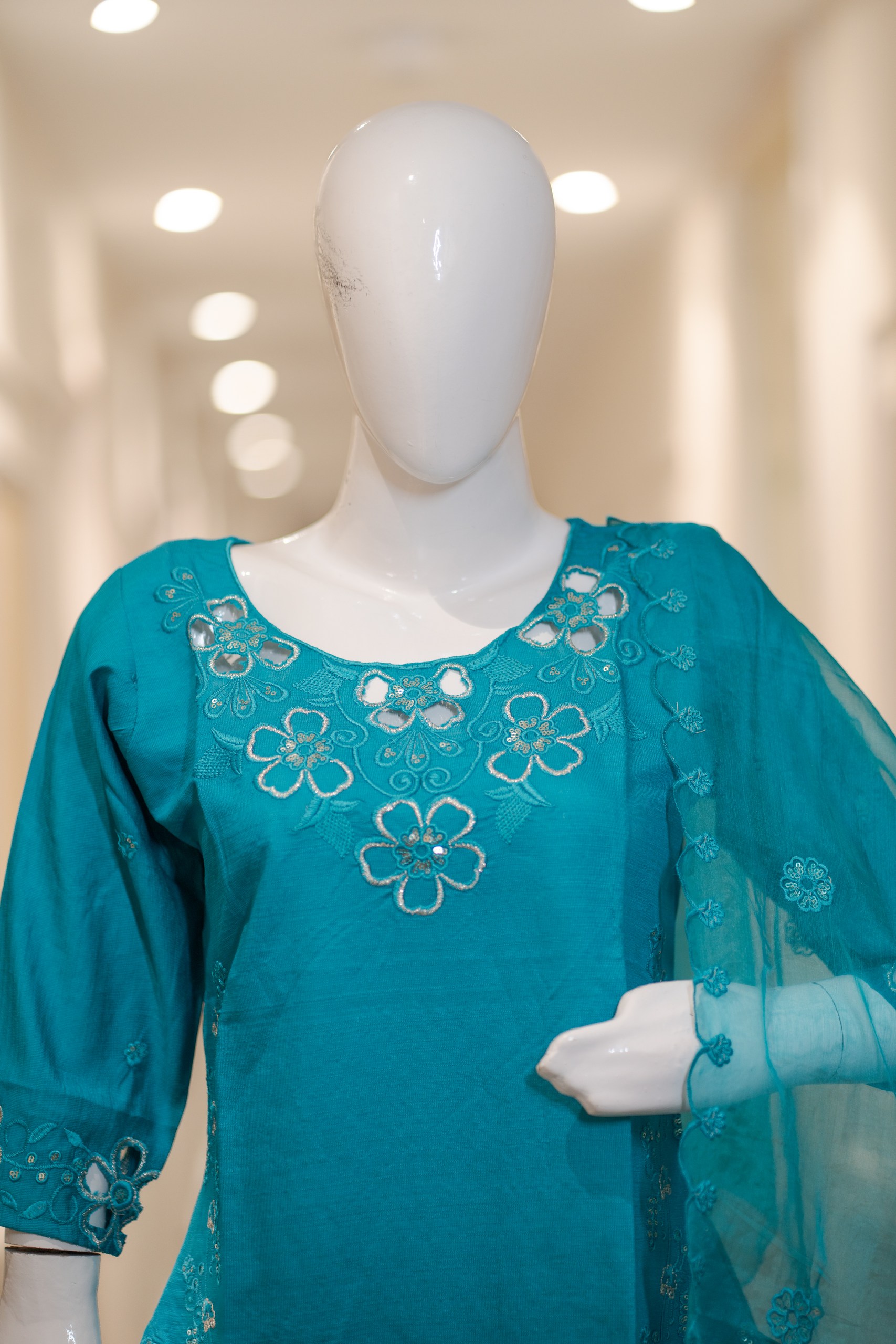 - Heavy cutwork on neck, sleeves & ghera