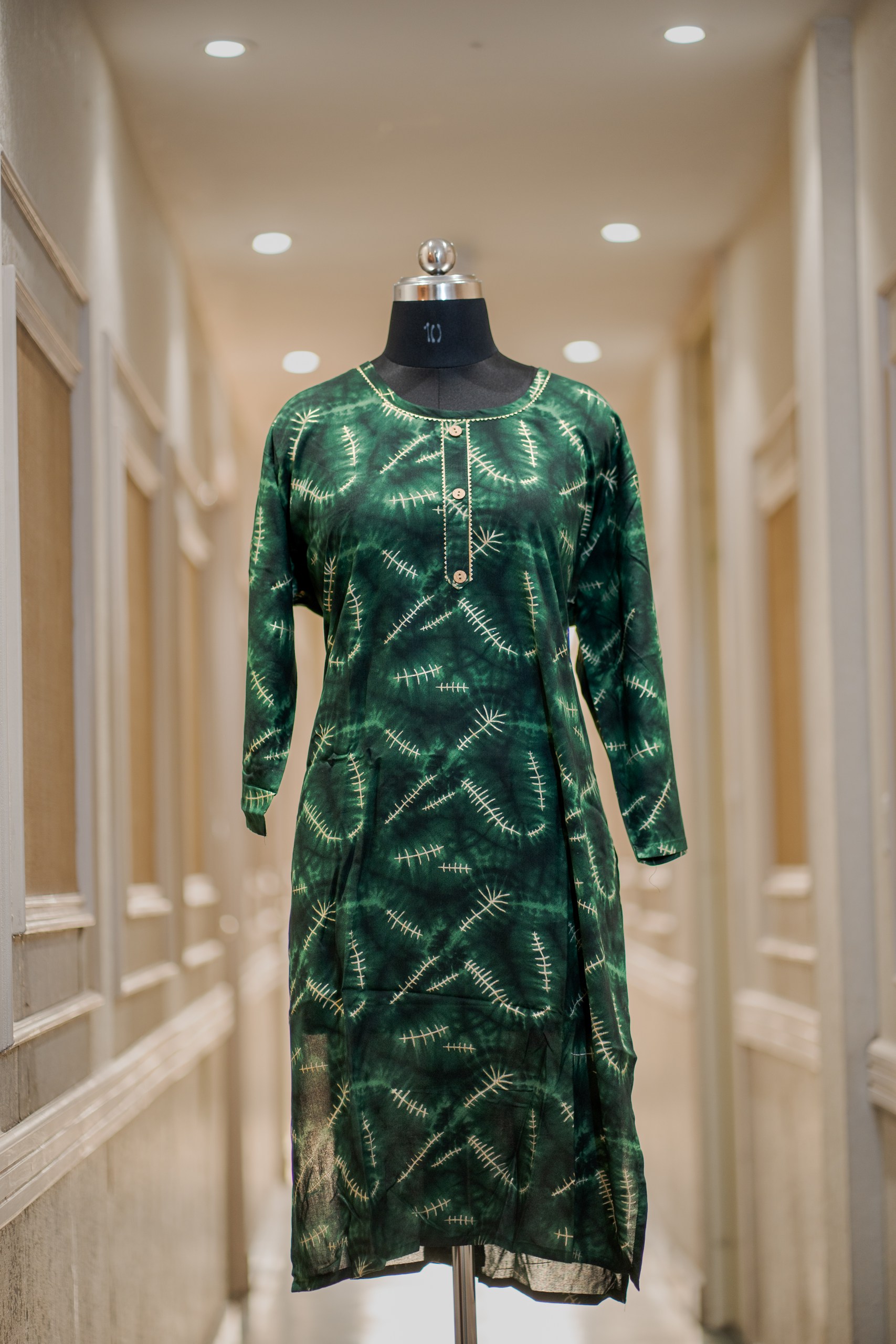 Elegant Green Printed Kurti with Pintuck Neck & Gota Patti Detailing for Women